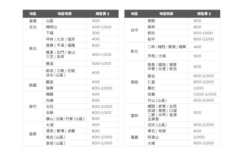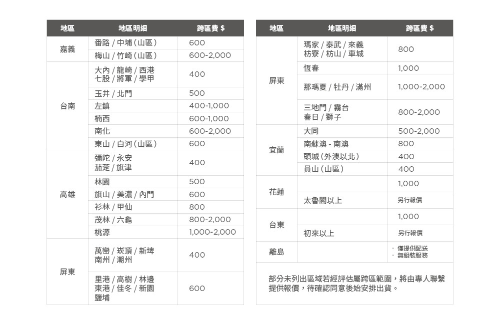 • 部分區域將增收跨區運送費 (按張數計算),請參閱下方跨區收費表。