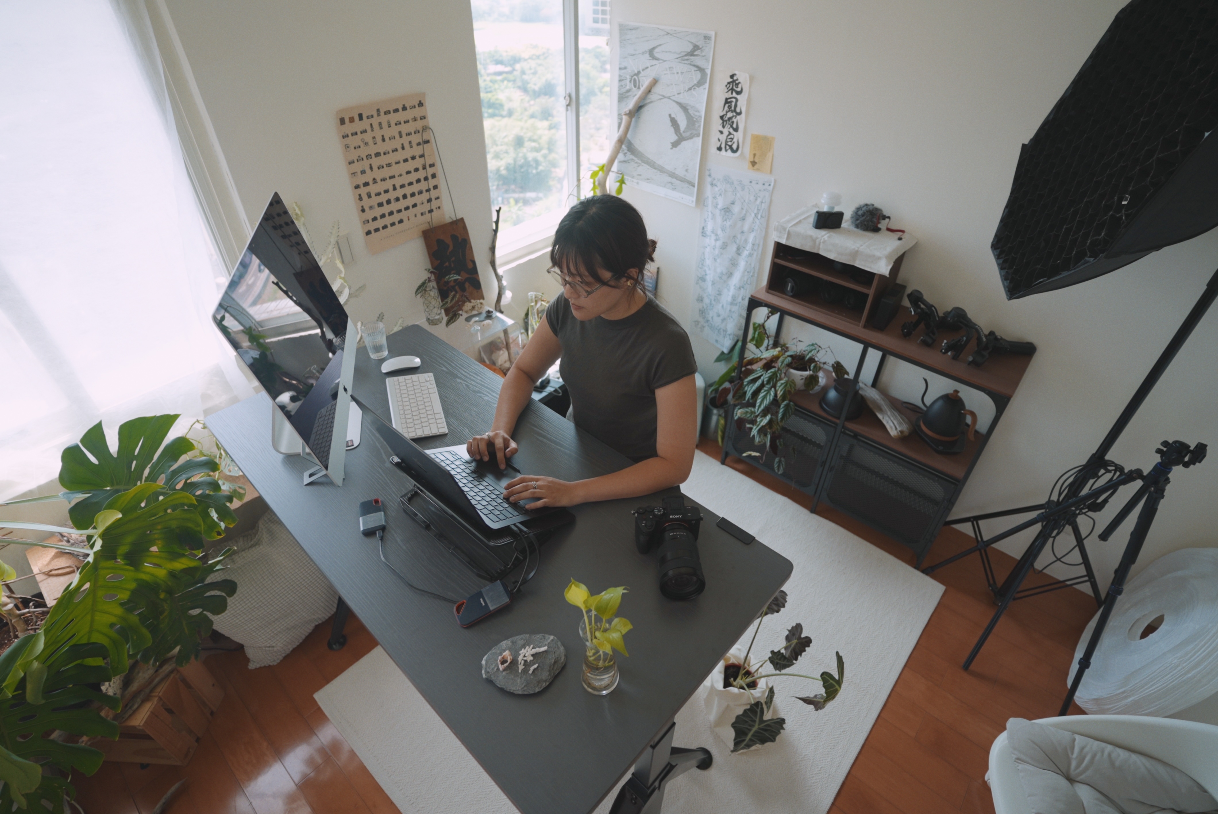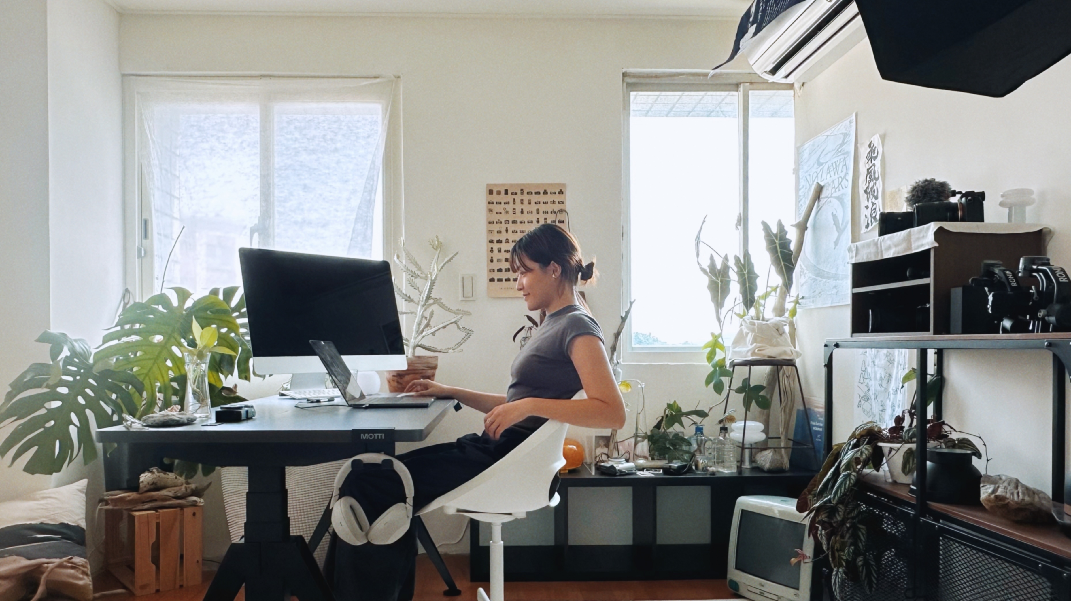 升降桌加入工作空間後,Ju 的工作節奏悄悄被重新調整。桌高能隨著她的專注度與身體狀態自由切換——站著剪片、站著回訊息,或坐下來做細部調整,都變得自然許多。過去被「久坐」牽著走的僵硬感不再,取而代之的是更輕盈、更流動的工作節奏。
