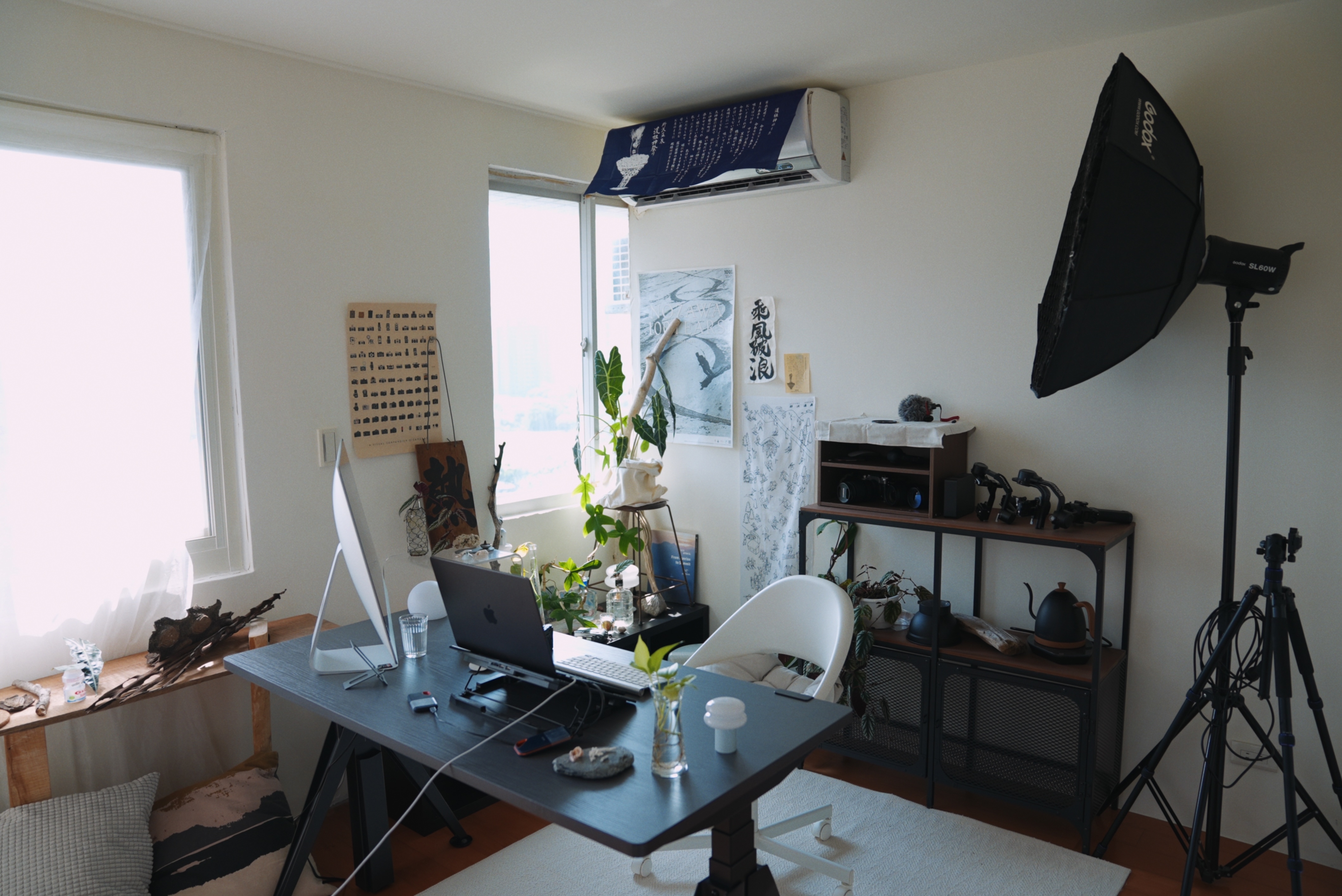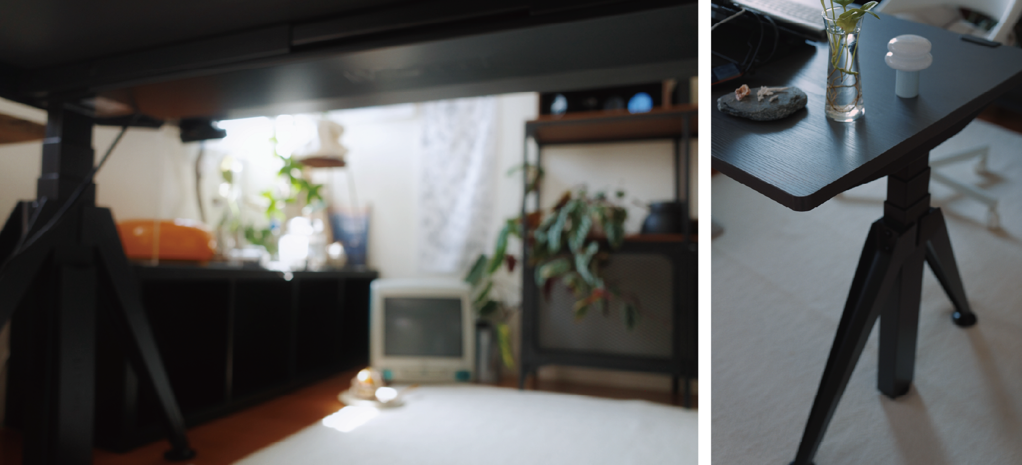 她特別喜歡 Kiin 的桌腳比例與線條,不帶傳統辦公家具的生硬,放在家中反而讓空間多了生活感,也讓工作跟日常之間更自然地連續。寬敞的桌面也讓她有更大的彈性,她經常與夥伴並肩討論畫面,有時也把桌子當作拍攝器材的輔助台使用,雙馬達升降結構穩定、安靜,即使作為拍攝器材的輔助,在升降過程也不影響工作品質。