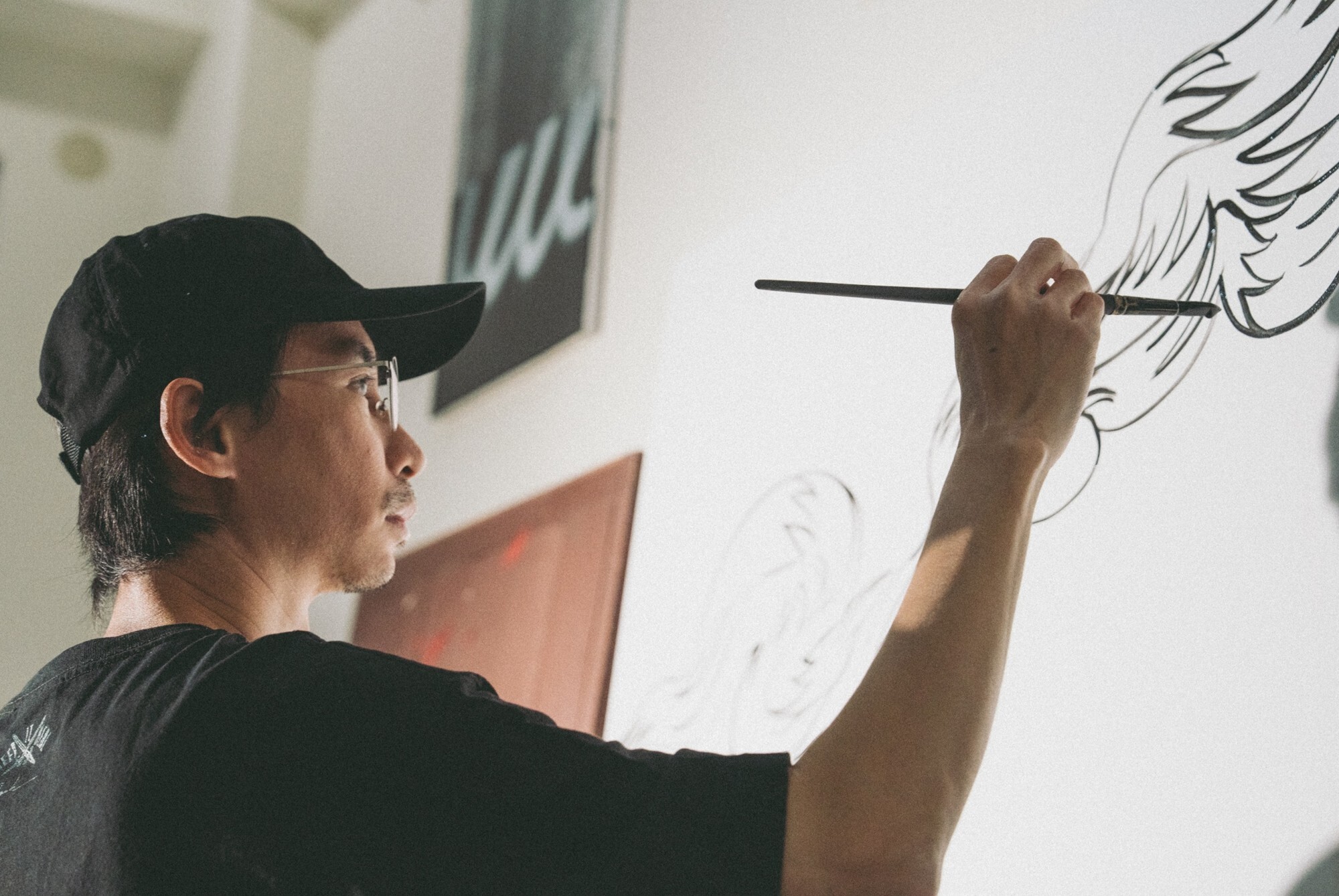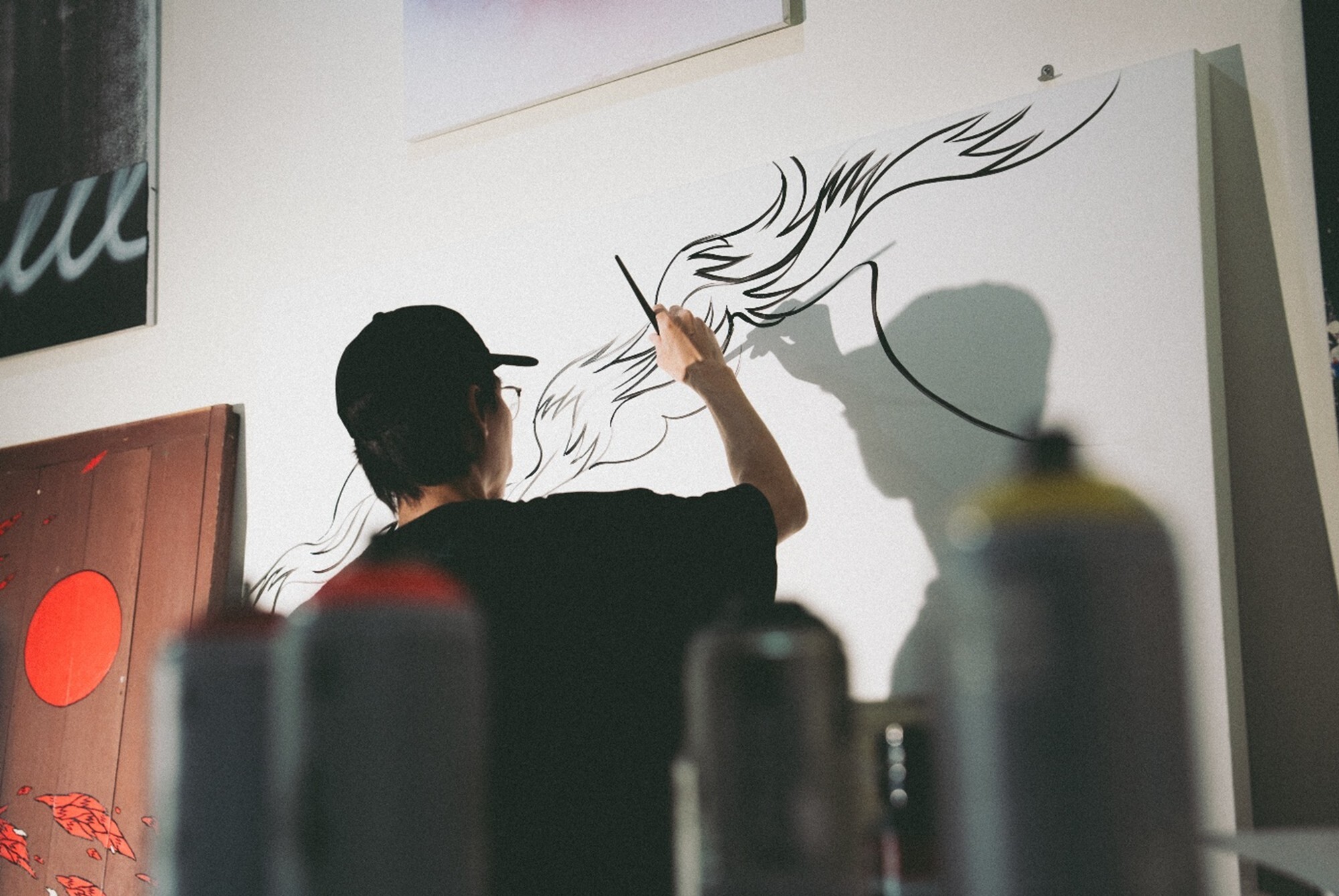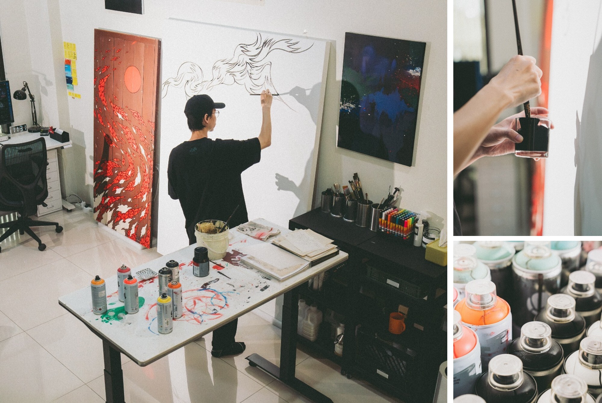 對塗鴉藝術家來說,「拉線」是一門核心技藝,深受作品擺放角度與高度的影響。REACH 坦言,過去曾試過把畫作釘在牆上來調整高度,卻因垂直角度的限制而處處卡關;把畫作平放在桌上又太低,長時間彎腰作業,身體的負荷也慢慢變得難以忽視。