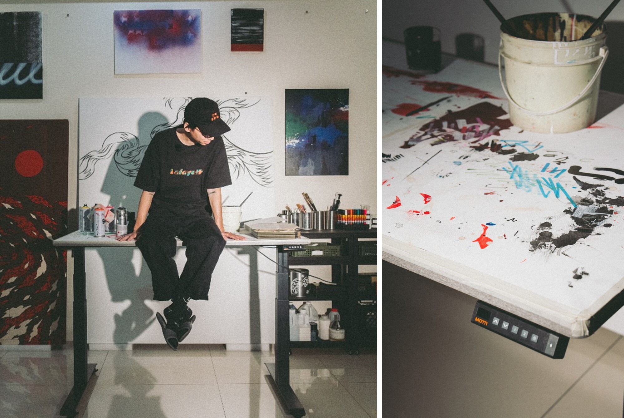 然而,近年來另一個挑戰正悄然逼近——身體的耐受度。長時間固定在工作室的桌前構圖,或者接下大型創作時,一站就是十幾個小時。肩頸與腰背的酸痛幾乎已是常態。一件件作品背後卻是創作者以身體為代價的日積月累。對於需要精準拉線、控制手腕力道的塗鴉藝術家而言,一張能靈活調整高度的工作桌,或許正是讓身體喘息的關鍵解方。