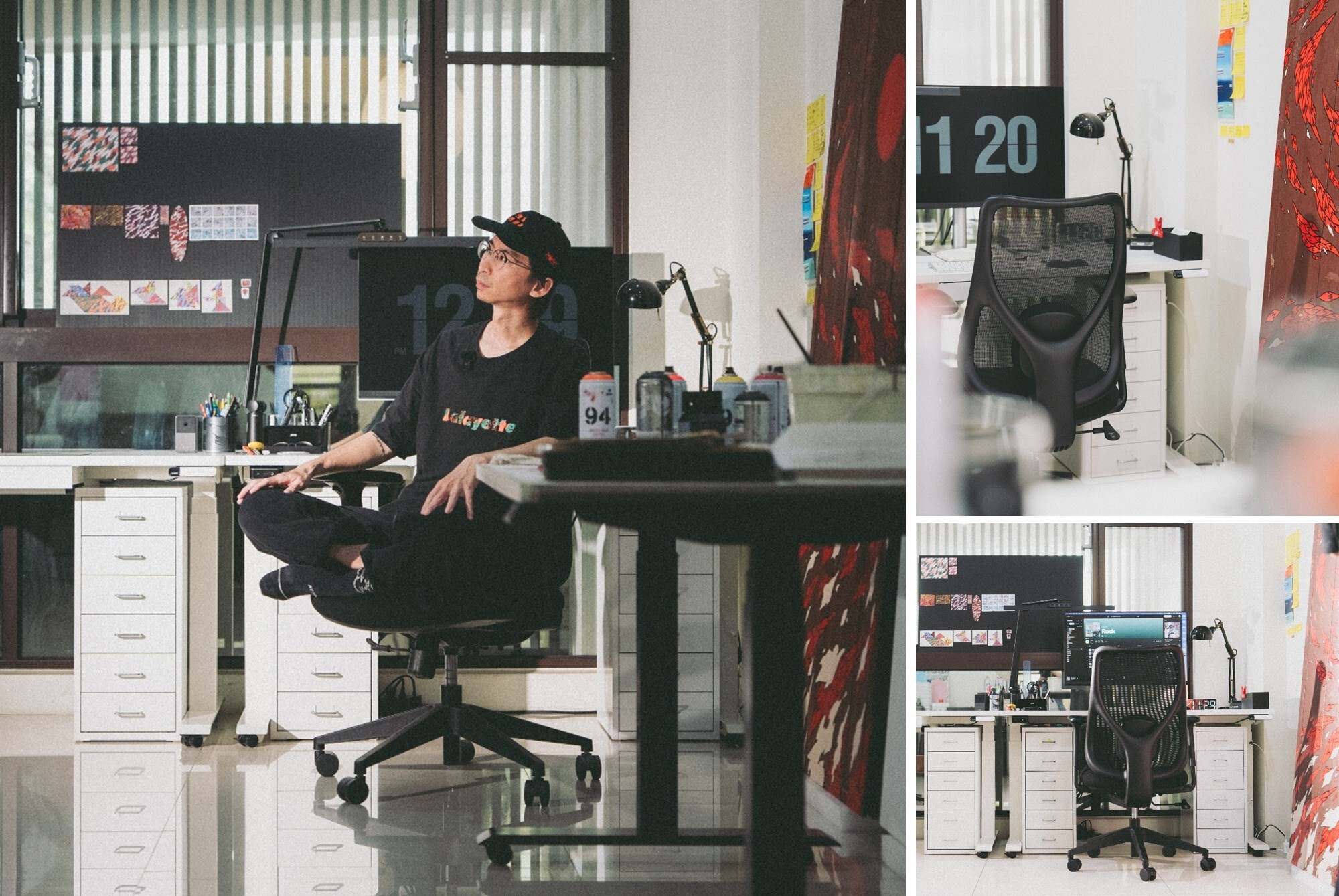 切換到電腦處理數位圖稿時,Toast 人體工學椅讓久坐不再是一種煎熬。可調式腰靠有效減少腰部懸空的壓力,3D 調節式扶手讓手肘與手腕都能找到最舒適的支撐角度,無段式傾仰椅背則能在專注工作與放鬆休息之間自由切換,REACH選擇黑色款,從椅身到椅腳細節全採同色系設計,整體俐落而一致。黑白色調的環境配置,讓桌椅與陳設自然隱身成背景,不搶走作品的目光。低調的設計,有時才是最好的襯托。